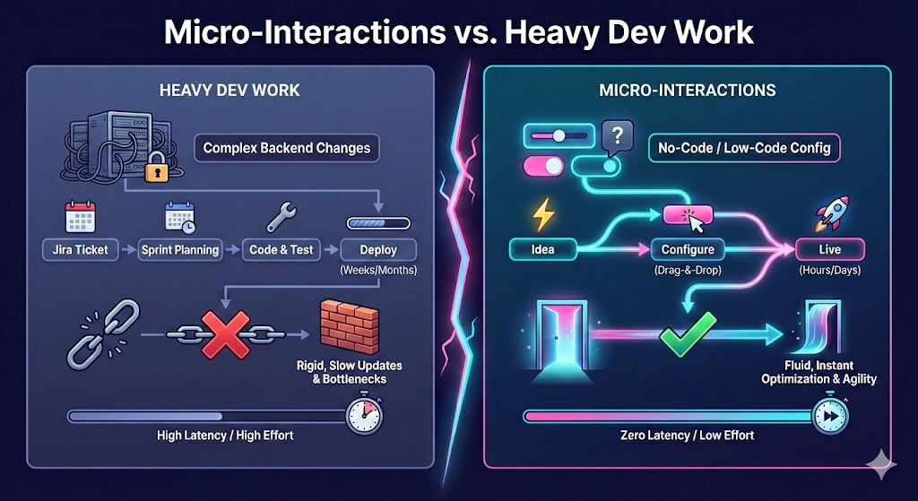 Through micro-interactions—small, interactive touchpoints that guide users toward their goals—teams can test and deploy new pathways in hours rather than months, without rebuilding the core site.